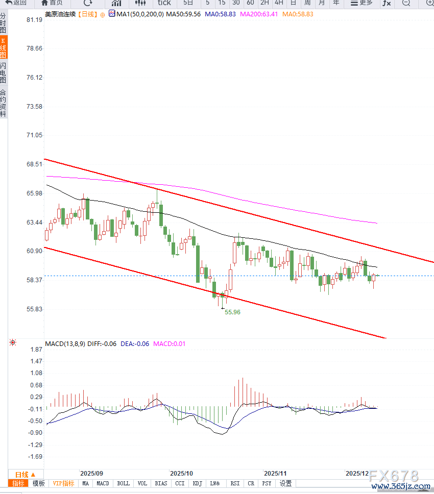 从时代走势不雅察,WTI价钱连续在58—60好意思元区间窄幅颤动,K线款式长远多头力量有限。价钱屡次在60好意思元隔邻遇阻,而下方58好意思元酿成阶段撑捏,短期呈现颓势横盘款式。